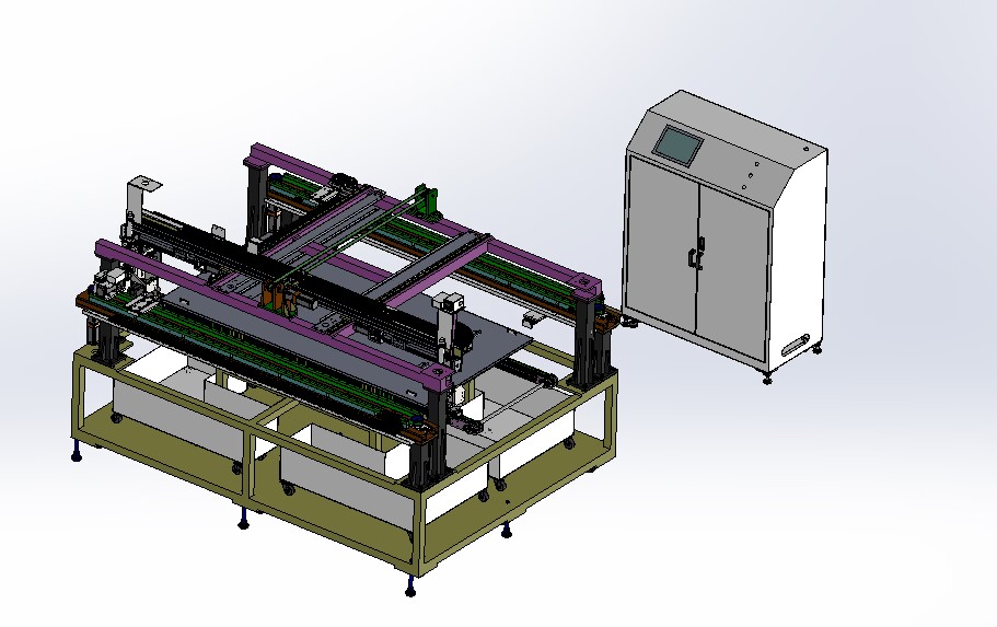 自動排版機的主要功能單元有:玻璃輸送定位系統(tǒng)、抓取行走系統(tǒng)、視覺檢測系統(tǒng)、電控系統(tǒng)等;通過以上功能單元,實現(xiàn)了將自動串焊機串焊好的電池串,按照工藝尺寸要求和排版方向順序自動排版鋪設到玻璃(EVA已經(jīng)鋪設)上,組成電池串陣列。玻璃/EVA通過傳輸線傳輸至指定位置,機械手抓取電池串實現(xiàn)CCD定位、自動旋轉、自動排版功能。設備通過同步帶傳輸與自動生產(chǎn)線對接,實現(xiàn)了自動流水作業(yè)。